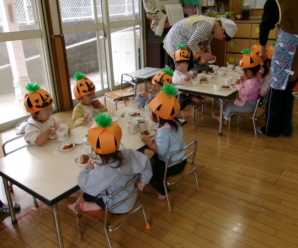 先日、ハロウィンの日にみんなで作ったハロウィン帽子をかぶって