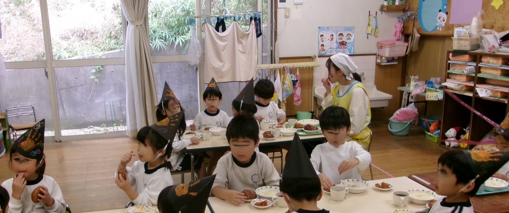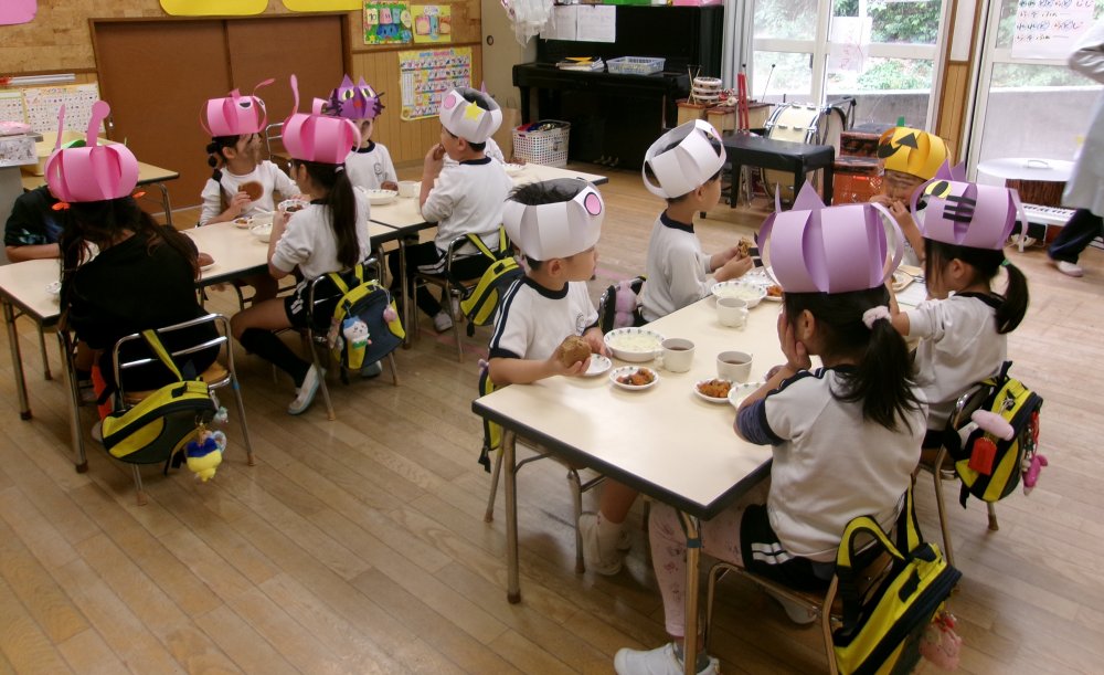 帽子をかぶって食べる給食はいつもと違って美味しかったです。