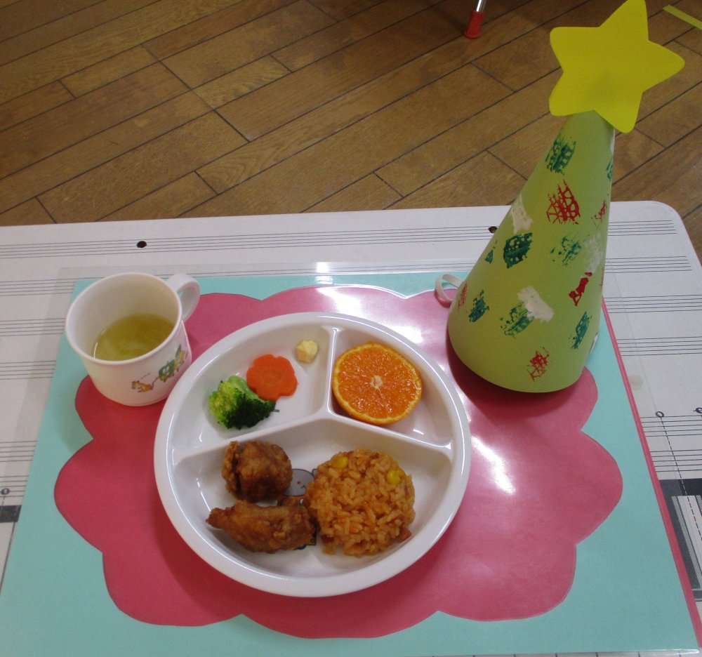 帽子をかぶってクリスマスメニューの給食を食べて