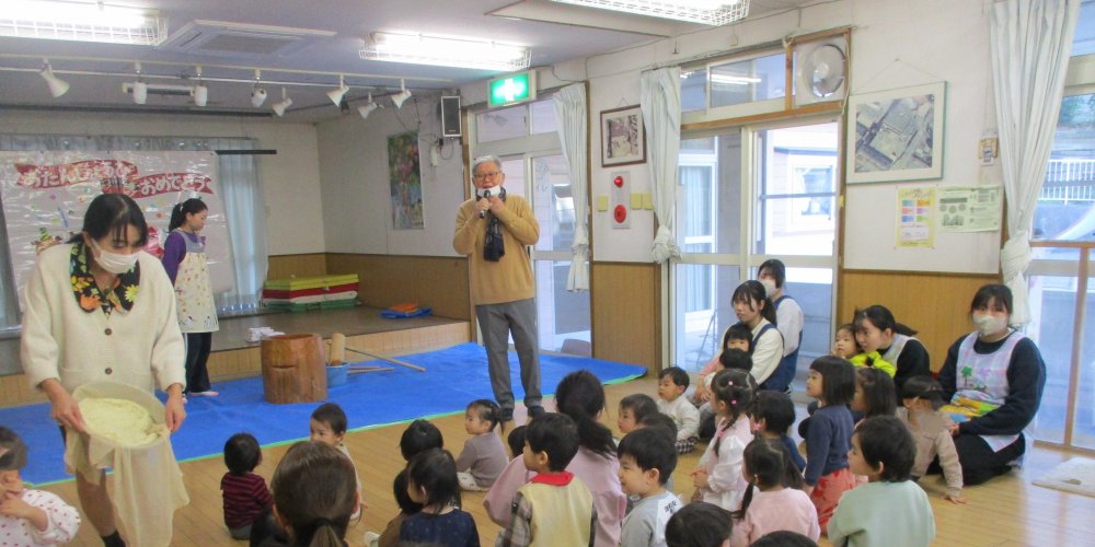 理事長先生が「お餅ってどうやってできるか知っているかな?」との質問から