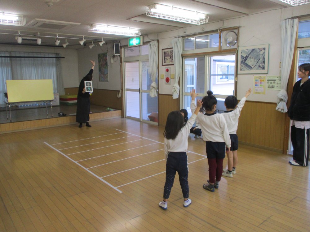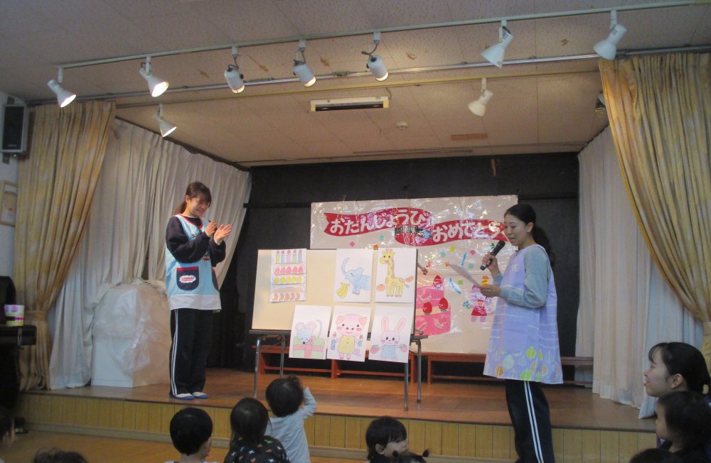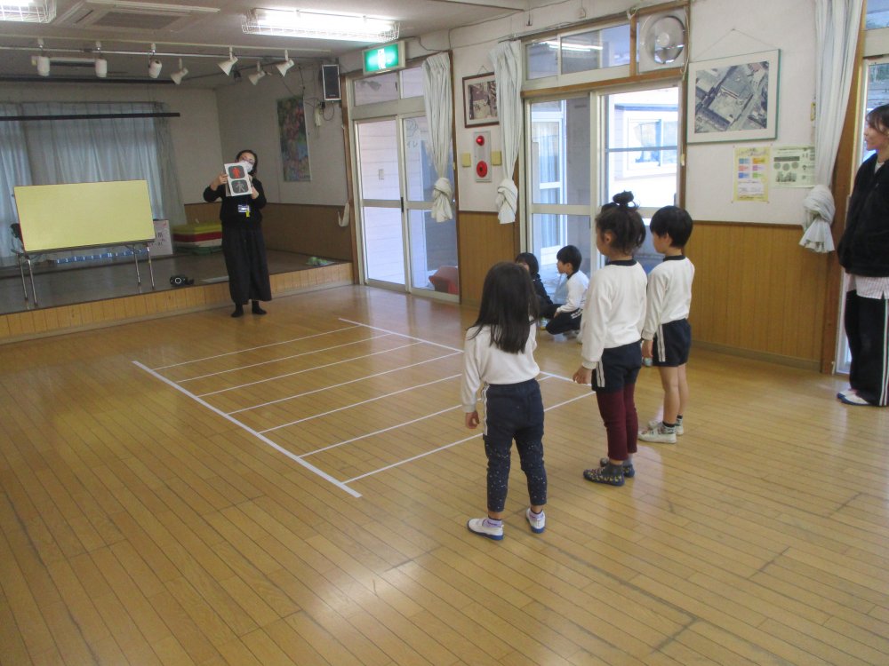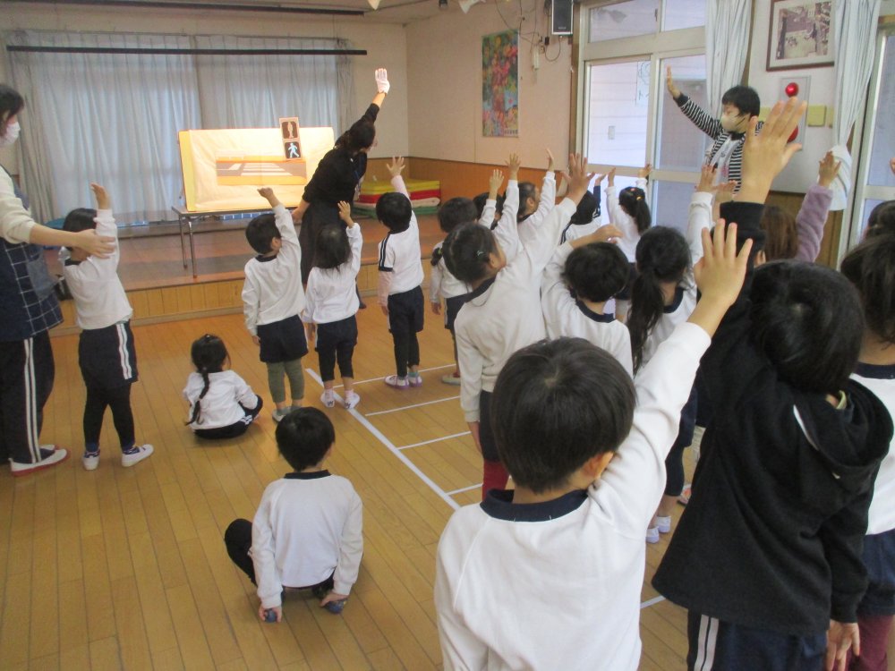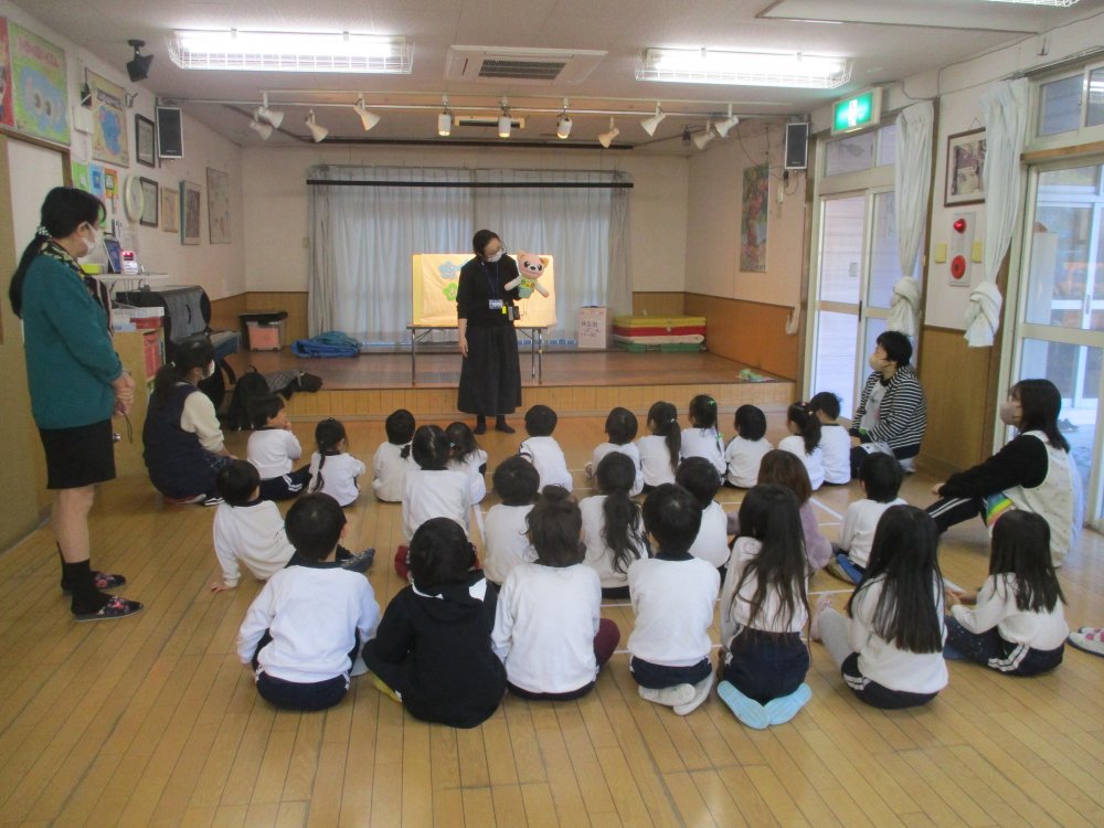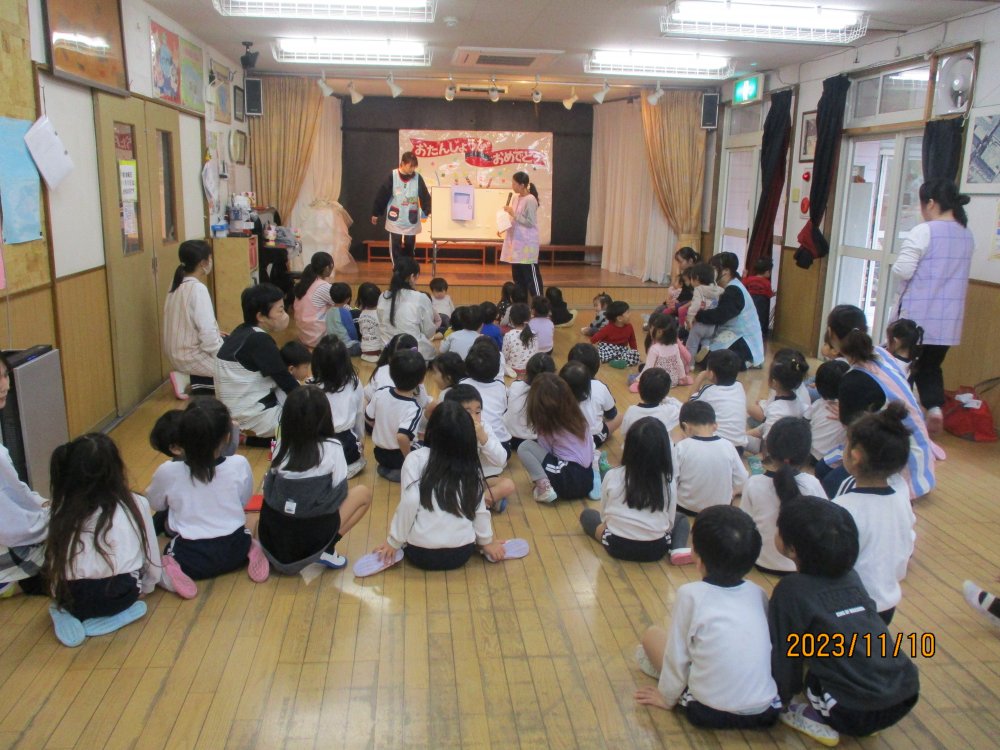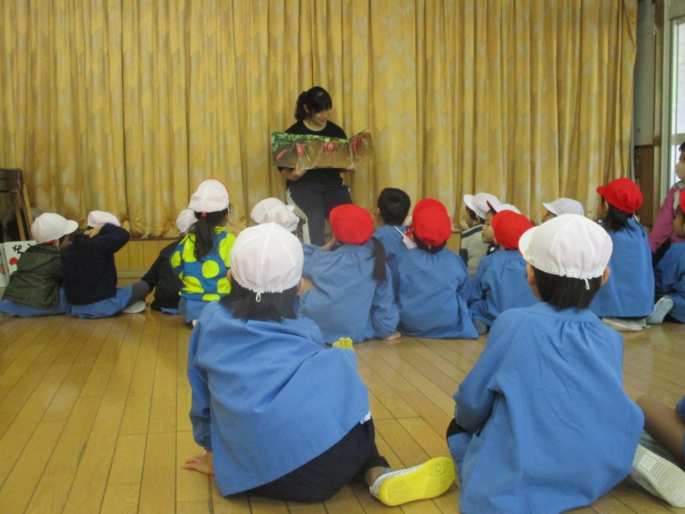ぱんだ・きりん・ぞう組は、まずはホールで紙芝居を読んでもらいお芋の掘り方を確認します。