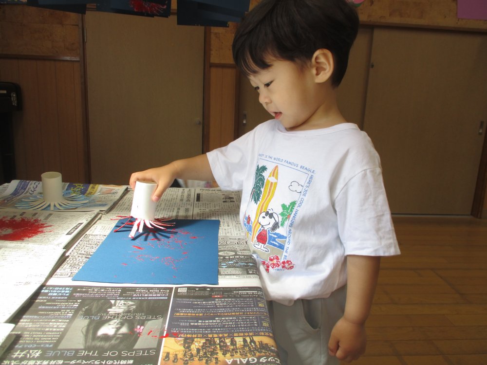 先生に絵具を付けてもらったトイレットぺーパーの芯を使って