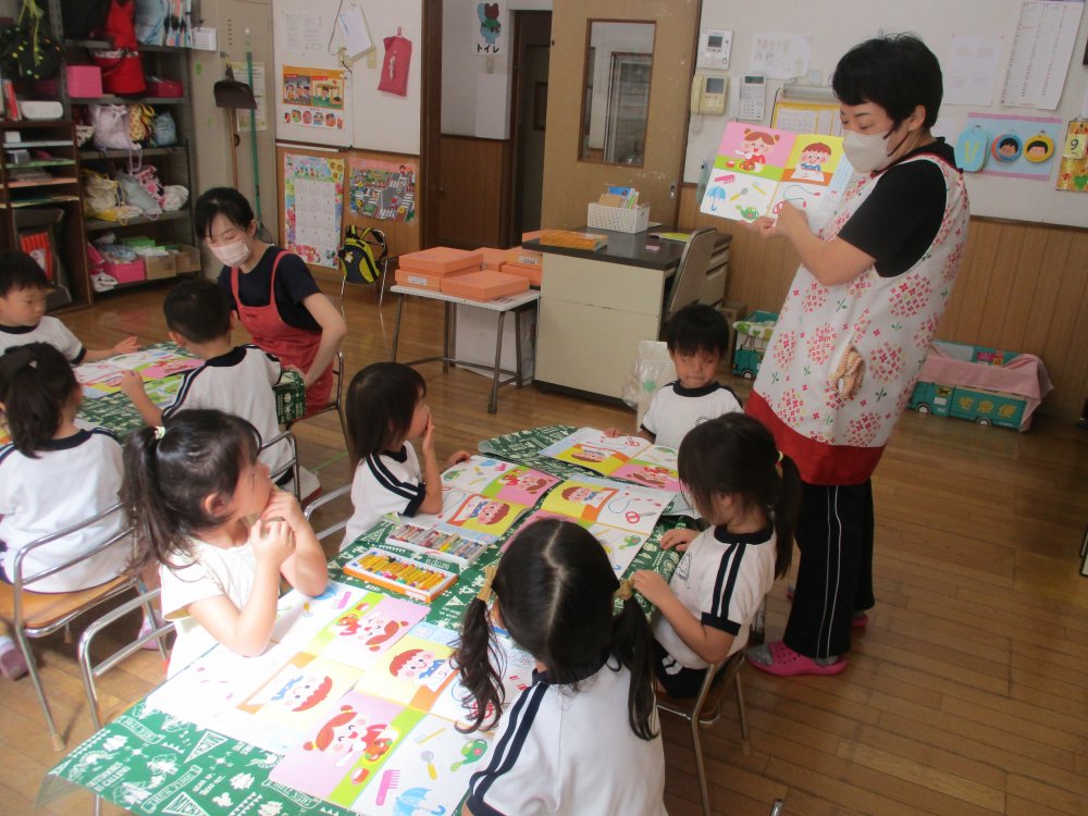 3歳クラスでは、先生が説明をしているのを真剣に聞いています。