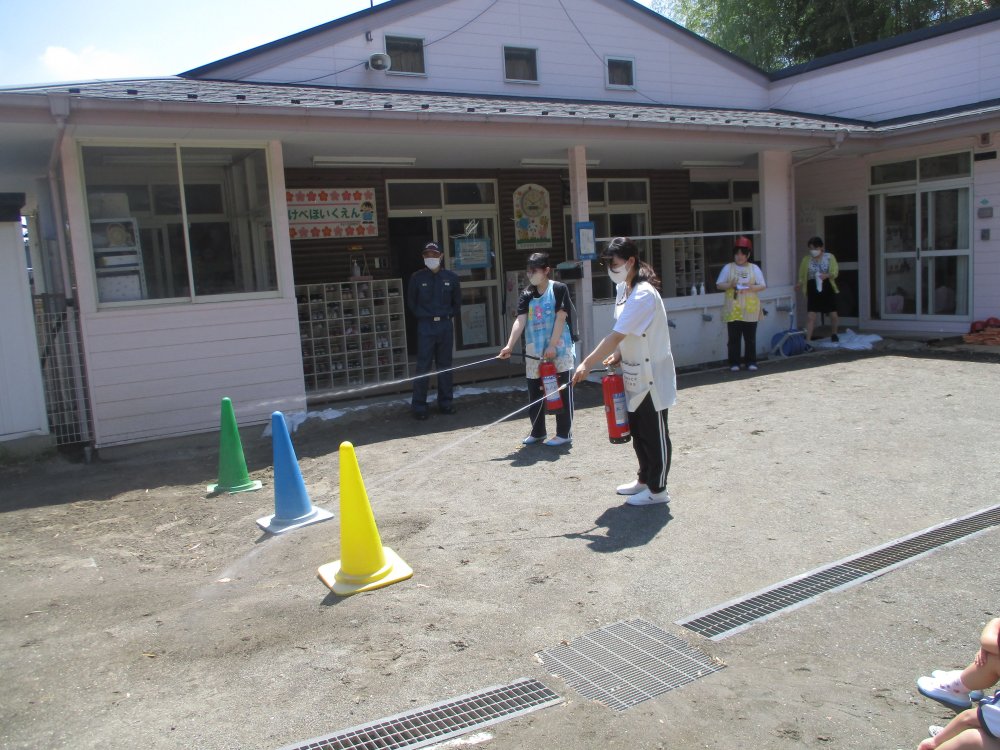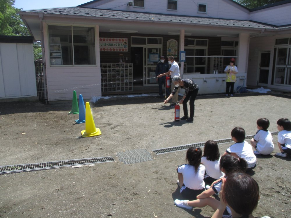 避難訓練が終了した後、消防署長さんに消火器の使い方を習い