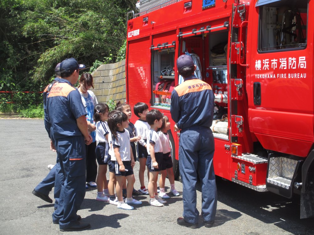 消防車の前で写真を撮影したあとは、消防車の見学をしました。