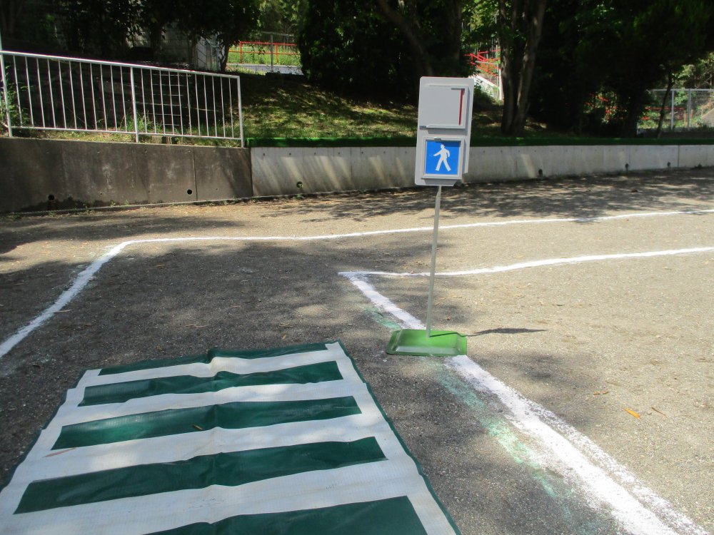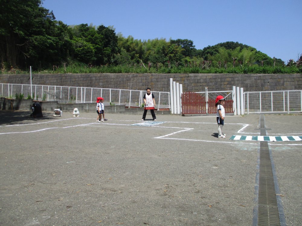 園庭に出たら、横断歩道、信号機、踏切を用意してそれぞれ渡る練習です。