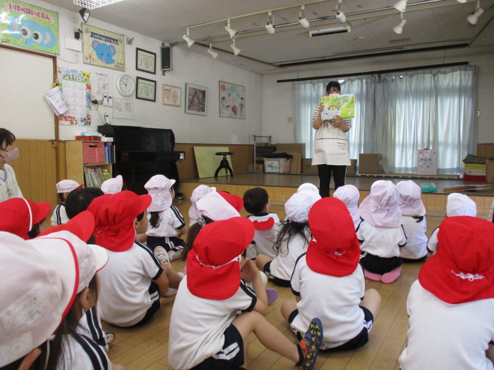 最初に、ホールで、交通ルールの紙芝居を真剣に聞きます。