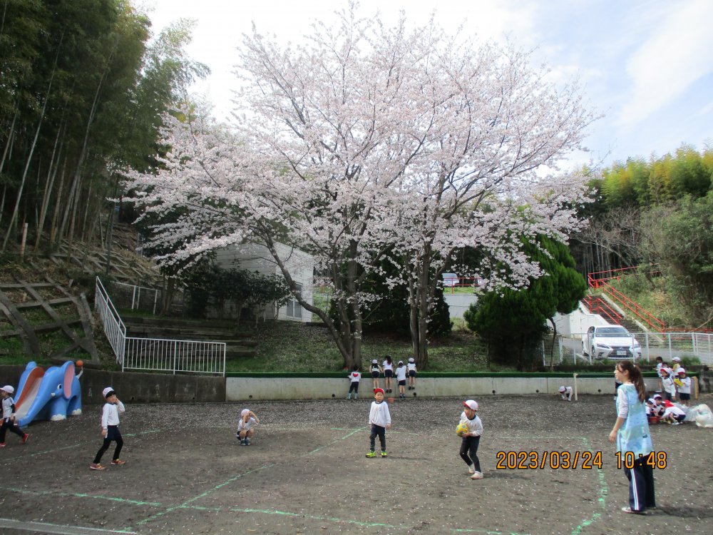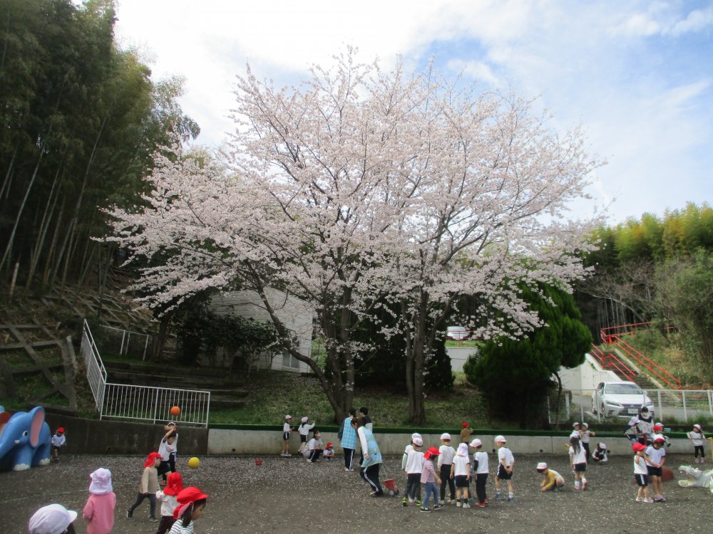 大きく枝をはった桜の木の下でお外遊びをしたり