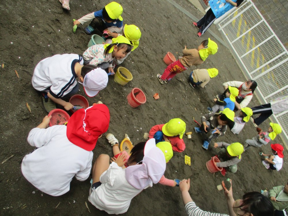 桜の花びらを使って砂遊びを楽します。