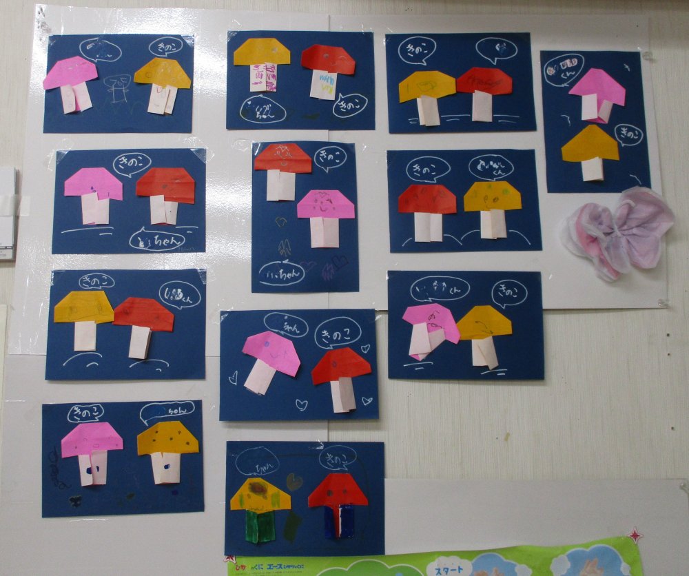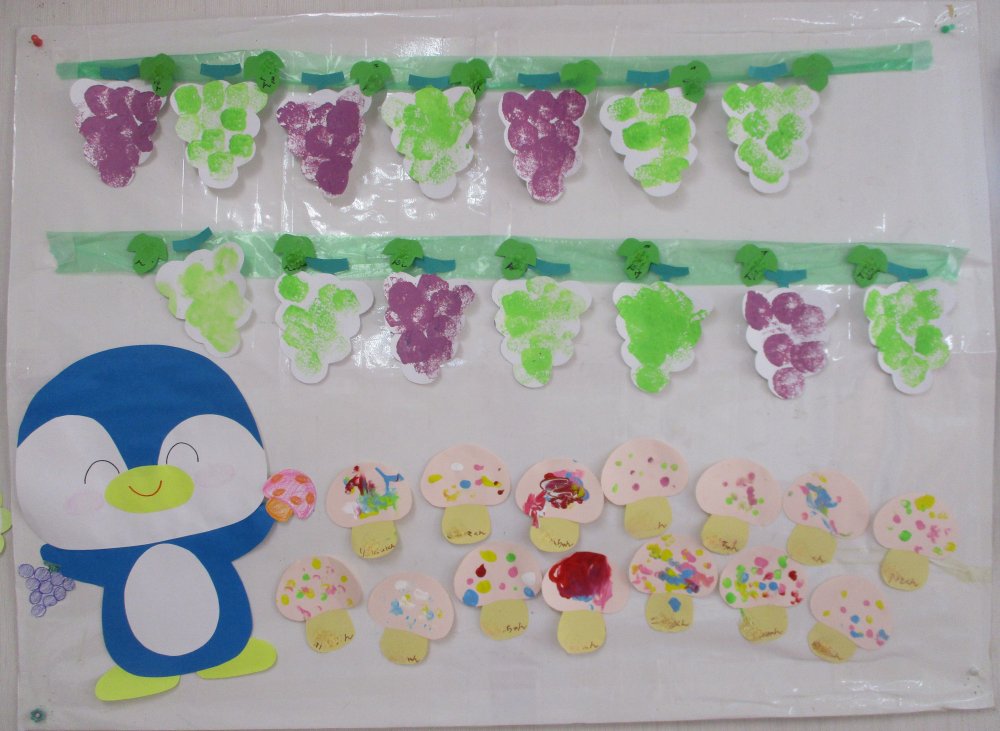 きのこや、月見団子、秋の味覚のブドウをみんなで楽しく作りました。